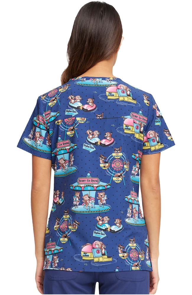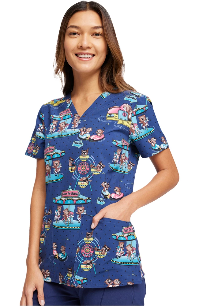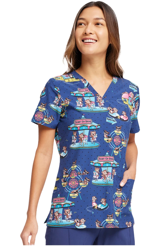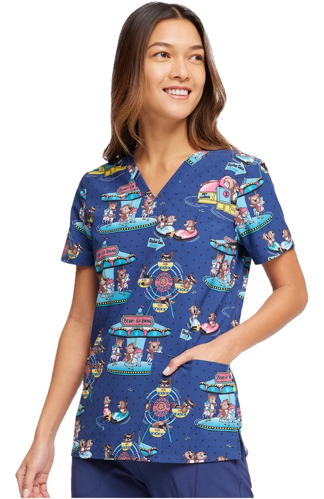 Patients of all ages will love spotting their favorite rides on the Fashion Prints by Cherokee Women’s Carnival Critters Print Scrub Top. You’ll love the sweet, nostalgic print and the roomy front pockets.