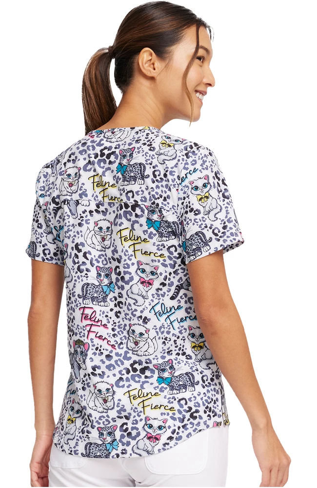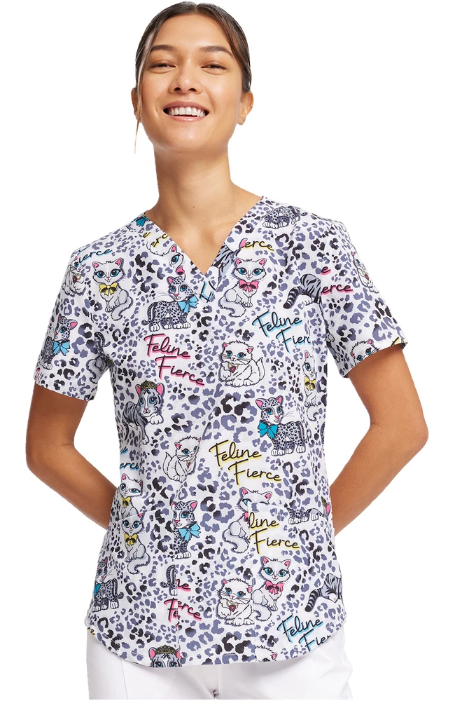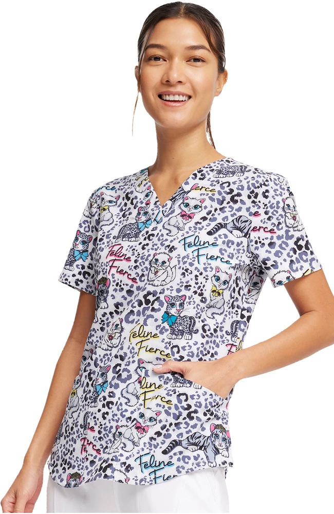 Show your wild side in the Fashion Prints by Cherokee Women’s Feline Fierce Print Scrub Top. The on-trend animal print is layered with curious kittens on this ultra-cute and functional scrub top.