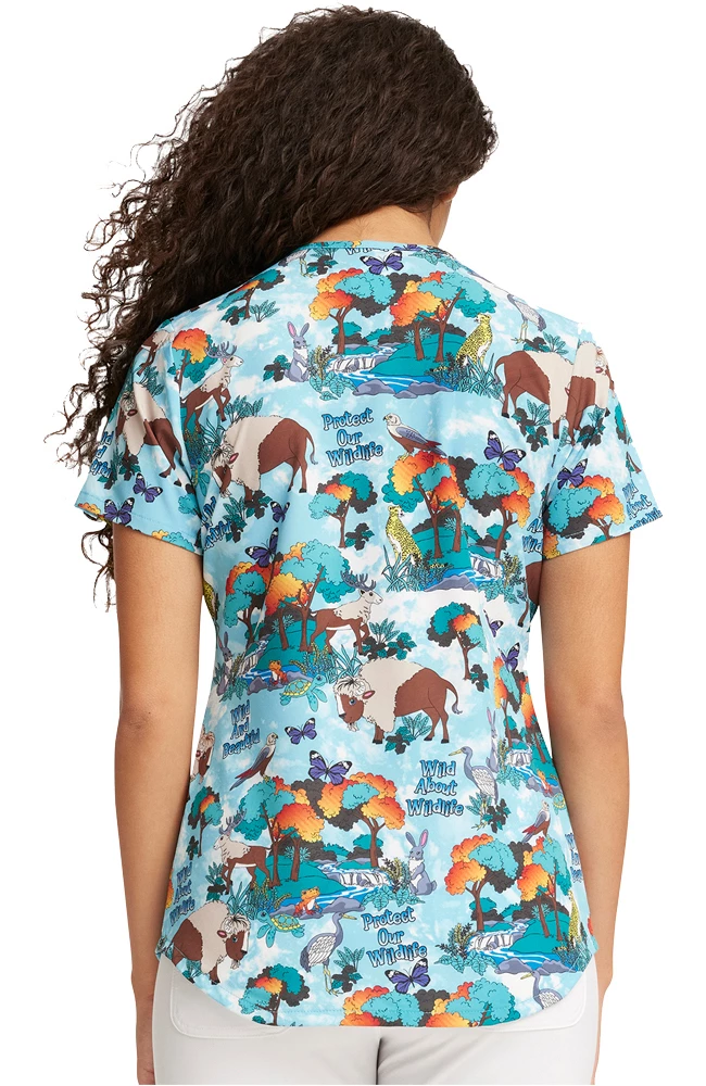 Feel like you’re roaming free in the Fashion Prints by Cherokee Women’s Wildlife Sanctuary Print Scrub Top. This nature-inspired top is made with recycled materials and features two front pockets for your essentials.