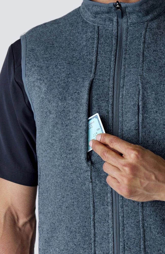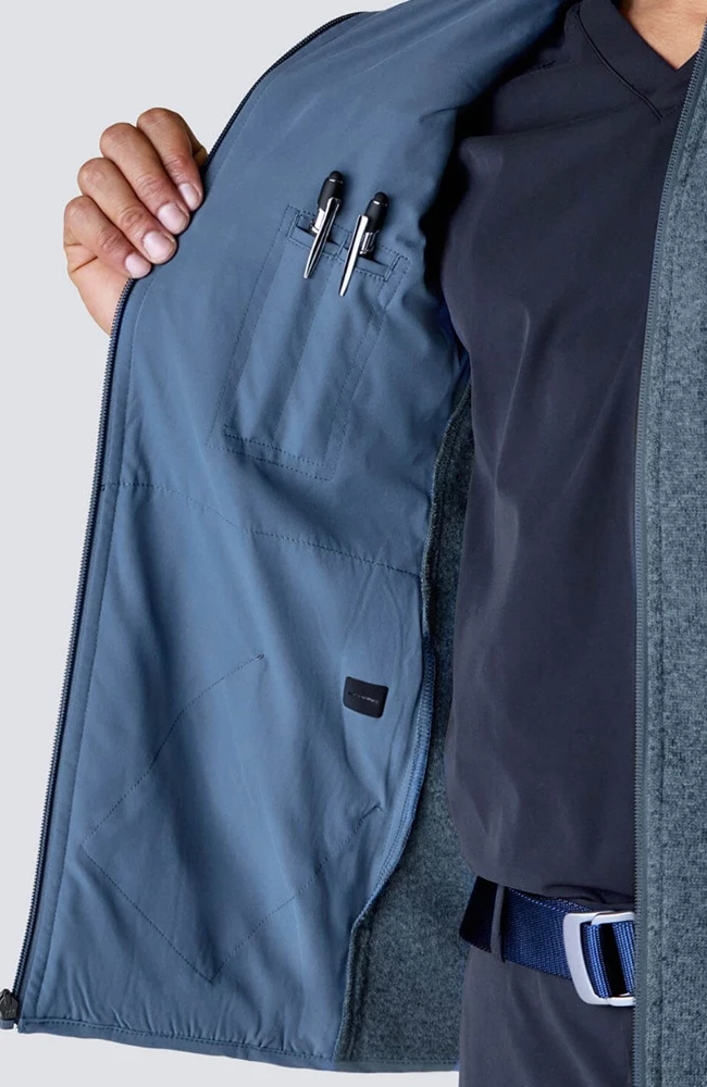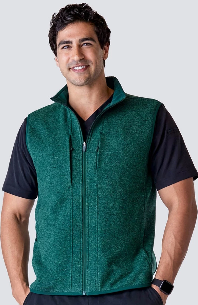 When you want a polished extra layer that is warm but won’t get in your way, the Medelita Men’s Strata Sweater Fleece Vest is for you. The soft, sweater-knit fleece looks and feels refined, while strategically placed scrub fabric inner panels help you stay cool and comfortable where you need it. With six pockets and a badge clip, it’s perfectly practical, whether you’re at work or on the go.