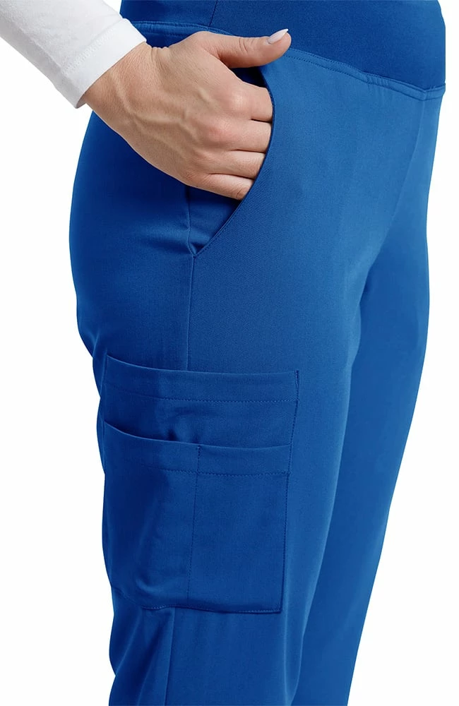 This yoga-style scrub pant from Marvella by White Cross have a full, comfort-knit waist band. They’re made from a comfortable cotton, polyester and spandex blend for a comfortable stretch. There are seamed pockets at the hips and cargo pockets with stitched-down flaps on each leg. Vented at the hem. The inseam is 31 1/2″.