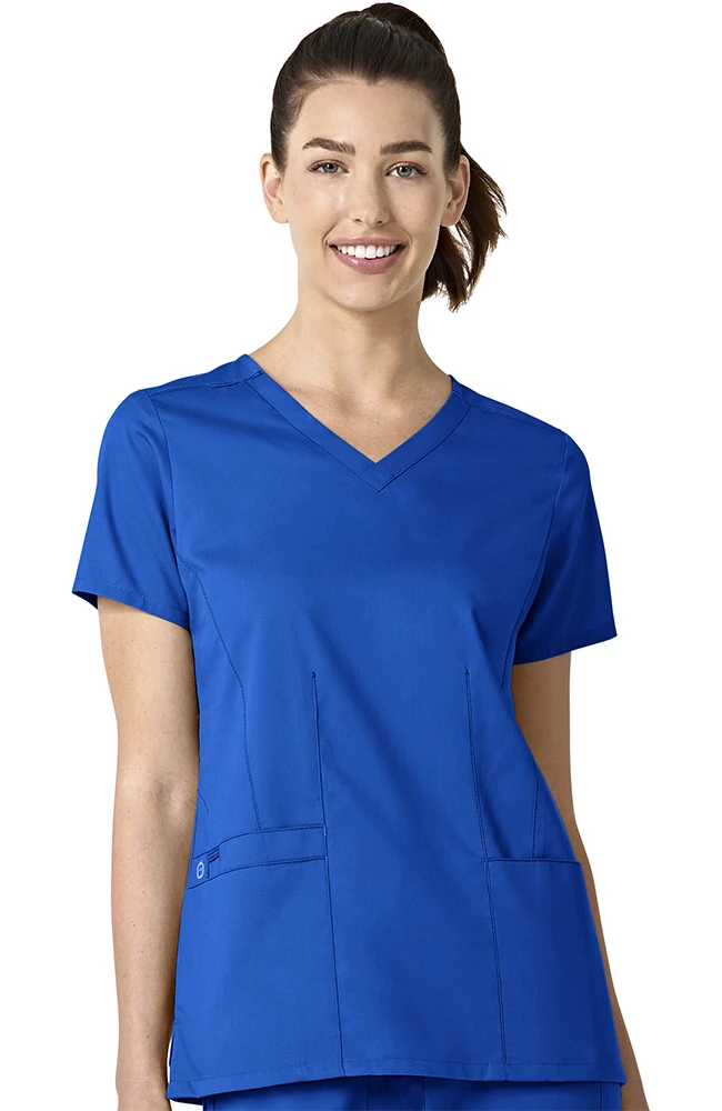 Flattering princess seams add style and shape to the WonderWORK Women’s Contoured V-Neck Solid Scrub Top. This comfortable and durable scrub top has two front pockets for your gear.