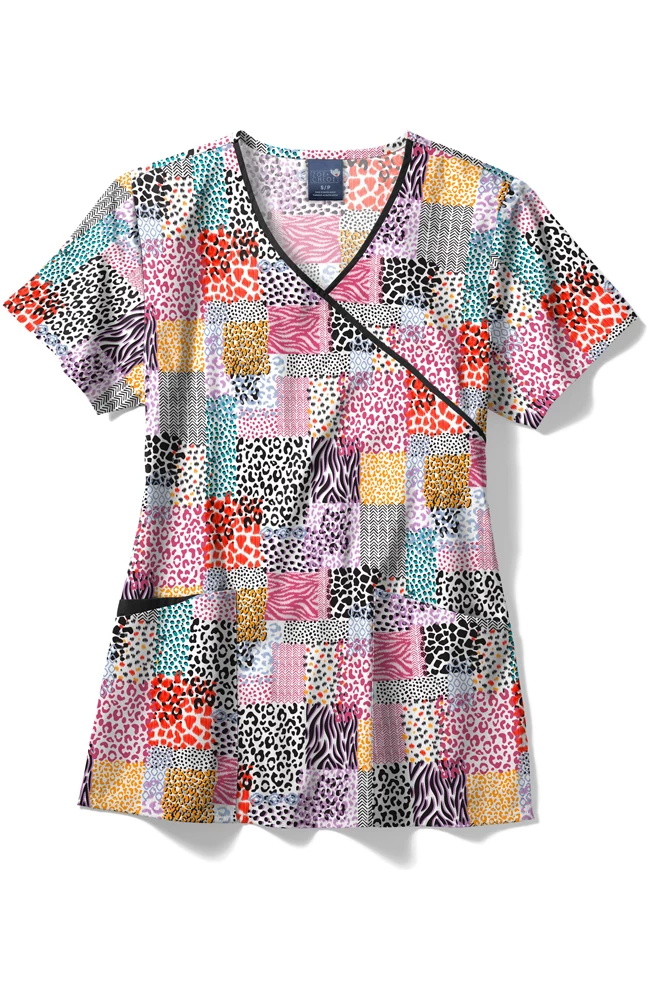 Add a little color to your uniform with the Zoe and Chloe Women’s Contrast Mock Wrap Pattern Patch Print Scrub Top. With two roomy front pockets and a cell phone pocket, it’s as functional as it is fun to wear.